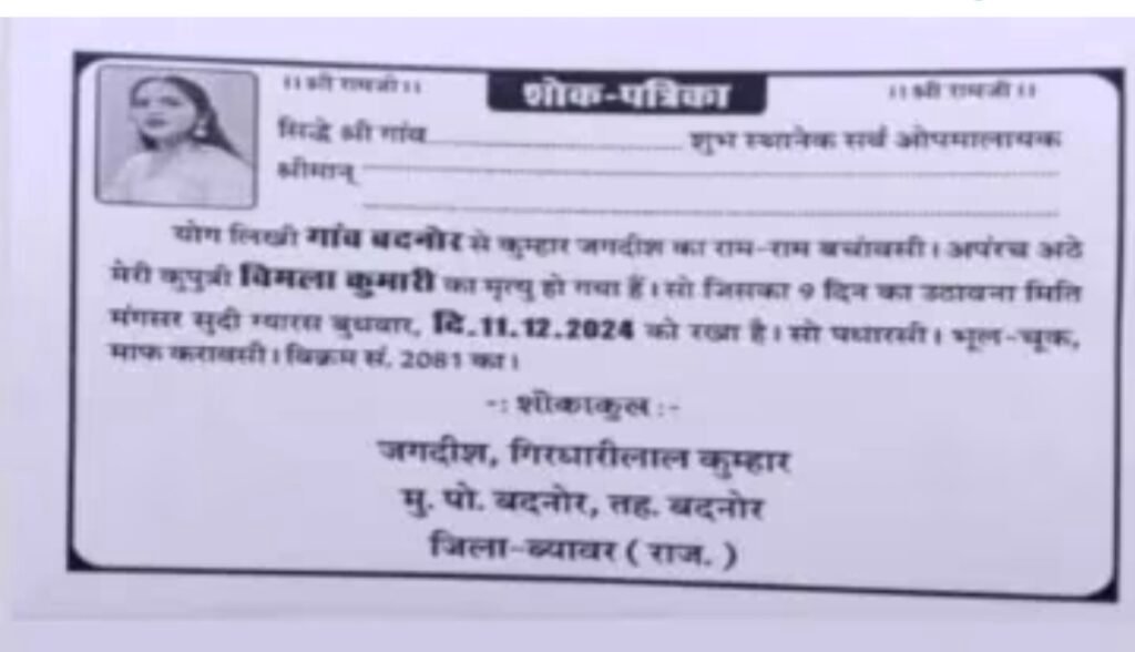 राजस्थान के ब्यावर जिले के बदनोर क्षेत्र में एक पिता ने अपनी बेटी के प्रेम विवाह से आहत होकर उसे मृत घोषित कर दिया और शोक पत्रिका छपवाकर समाज को ‘मृत्युभोज’ के लिए आमंत्रित किया। यह घटना सोशल मीडिया पर चर्चा का विषय बनी हुई है।