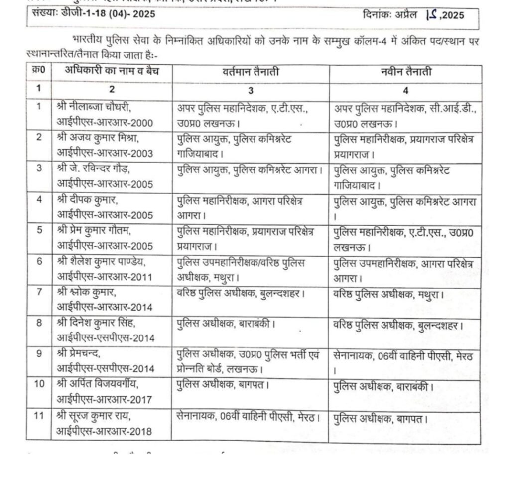 - नीलाब्जा चौधरी को एडीजी एटीएस लखनऊ से एडीजी सीआईडी लखनऊ में स्थानांतरित किया गया है।