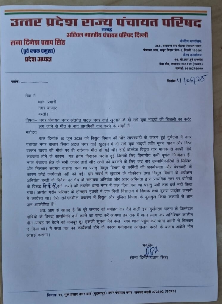 राणा दिनेश प्रताप सिंह ने बताया कि मृतक परिवार अत्यंत गरीब है। एक युवक होटलों में श्रमिक के रूप में कार्य करता था, जबकि दूसरा युवक निजी विद्यालय में शिक्षक था। बावजूद इसके प्रशासन ने अभी तक मृतकों के परिजनों से संवेदना तक प्रकट नहीं की। उन्होंने प्रशासन से पीड़ित परिवार को मुआवजा देने, दोषी अधिकारियों पर कार्रवाई करने और बिजली विभाग की लापरवाही की उच्चस्तरीय जांच कराने की मांग की है।
