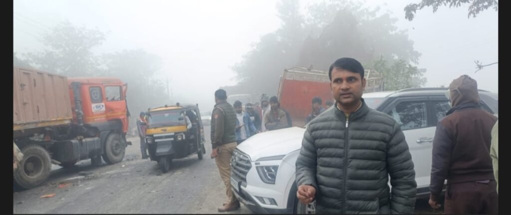 जिले के कलवारी थाना क्षेत्र में शुक्रवार की सुबह घने कोहरे ने भयावह रूप ले लिया, जब लुंबिनी–दुद्धी मार्ग पर बेईली गांव के पास एक के बाद एक कर करीब पाँच वाहन आपस में टकरा गए। सुबह लगभग 9 बजे हुई इस दुर्घटना में दृश्यता बेहद कम होने के कारण वाहन चालकों को आगे का रास्ता बिल्कुल नजर नहीं आ रहा था, जिसके चलते टक्करें लगातार होती चली गईं।