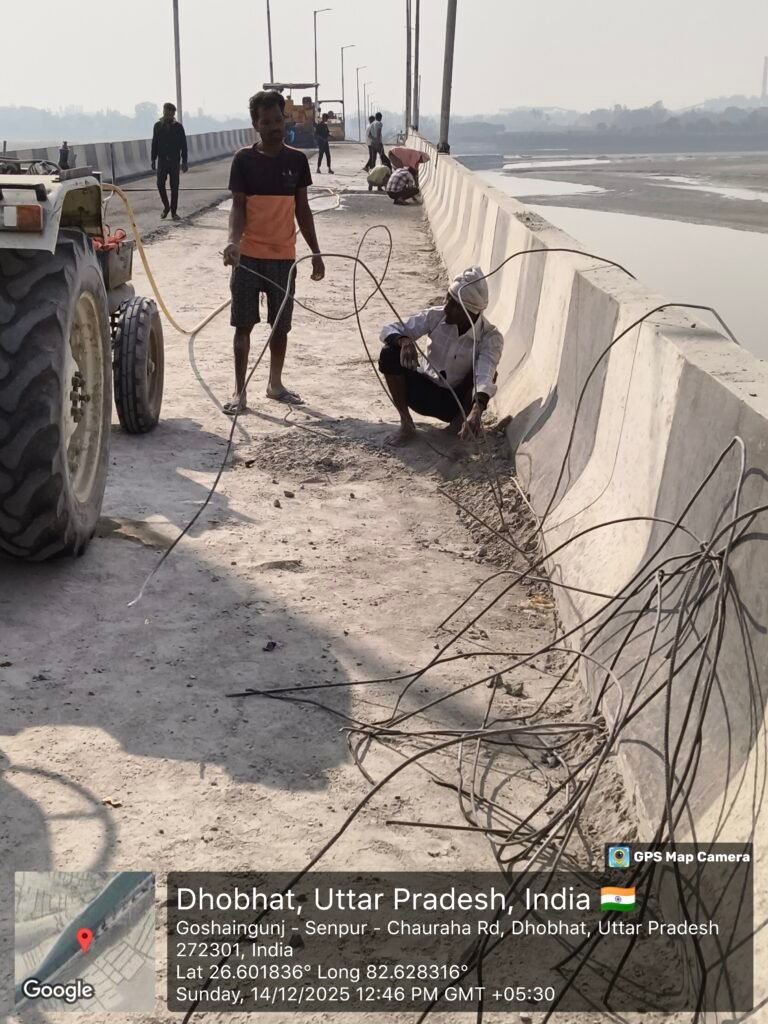 पुल के बीच स्थित ओवरहाइट हिस्से पर मजदूर सरिया निकालकर तोड़ते हुए पाए गए। जैसे ही मीडिया द्वारा वीडियो बनाया जाने लगा, मजदूरों ने काम रोक दिया और यह कहते हुए पीछे हट गए कि रिकॉर्डिंग की जा रही है। इसके आगे मशीनों के माध्यम से सड़क पर डामर और गिट्टी का लेपन किया जा रहा था।