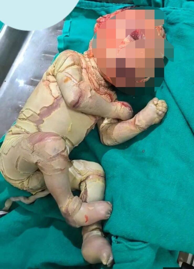 डॉक्टरों के अनुसार, प्रारंभिक जांच में यह आशंका जताई जा रही है कि नवजात हार्लेक्विन बेबी सिंड्रोम जैसी दुर्लभ त्वचा संबंधी बीमारी से प्रभावित हो सकता है। इस स्थिति में त्वचा का विकास असामान्य रूप से होता है, जिससे शरीर पर मोटी, खिंची हुई परतें दिखाई देती हैं।