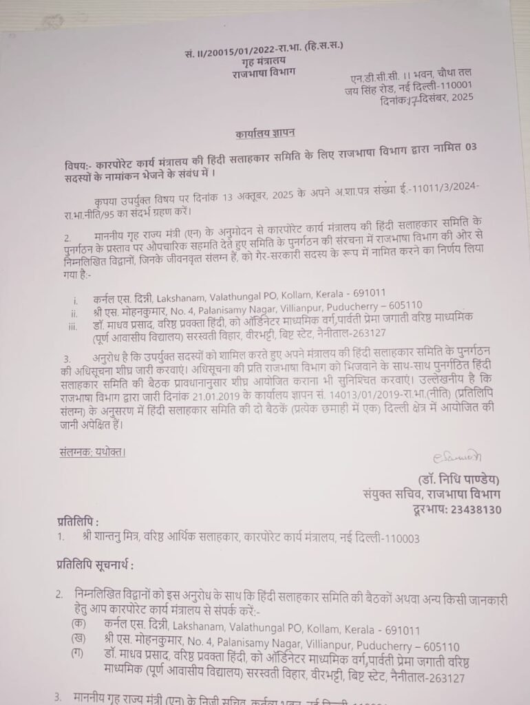 राजभाषा विभाग की ओर से जारी आदेश के अनुसार यह नामांकन गृह राज्य मंत्री (एन) की स्वीकृति से किया गया है। समिति के पुनर्गठन के तहत देश के विभिन्न राज्यों से हिंदी भाषा, साहित्य और शिक्षण के क्षेत्र में उल्लेखनीय योगदान देने वाले विशेषज्ञों को शामिल किया गया है, ताकि मंत्रालयों में राजभाषा हिंदी के प्रभावी कार्यान्वयन को और सशक्त बनाया जा सके।