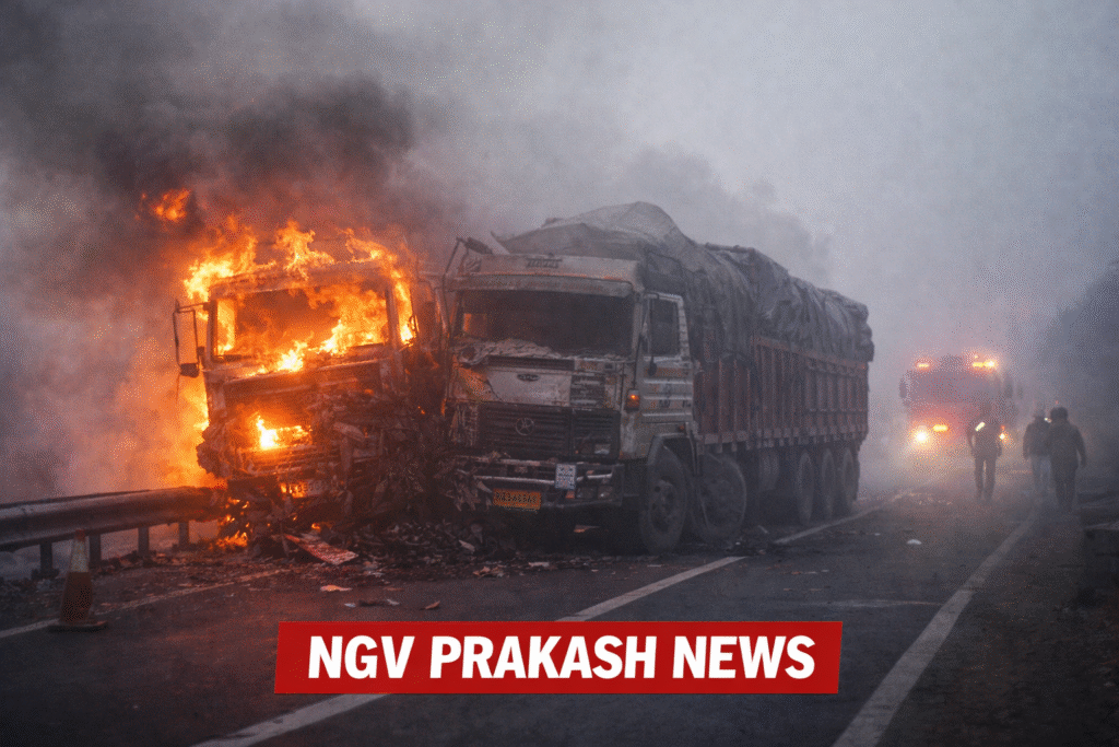 कोहरे में दो ट्रकों की भिड़ंत के बाद लगी आग, केबिन में फंसे चालक की जिंदा जलकर मौत