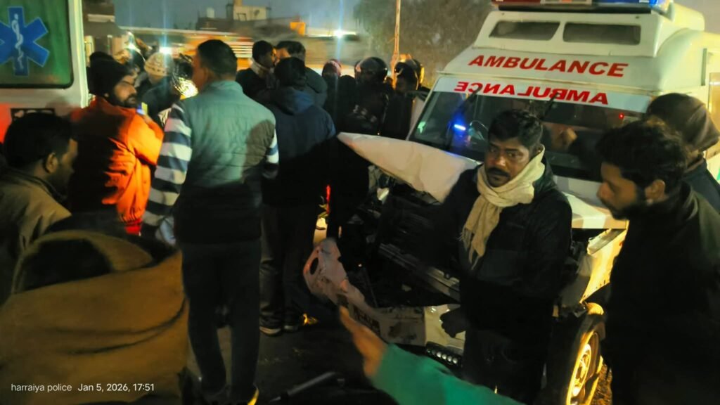 हर्रैया में अनियंत्रित एम्बुलेंस कई वाहनों से टकराई, चार लोग घायल