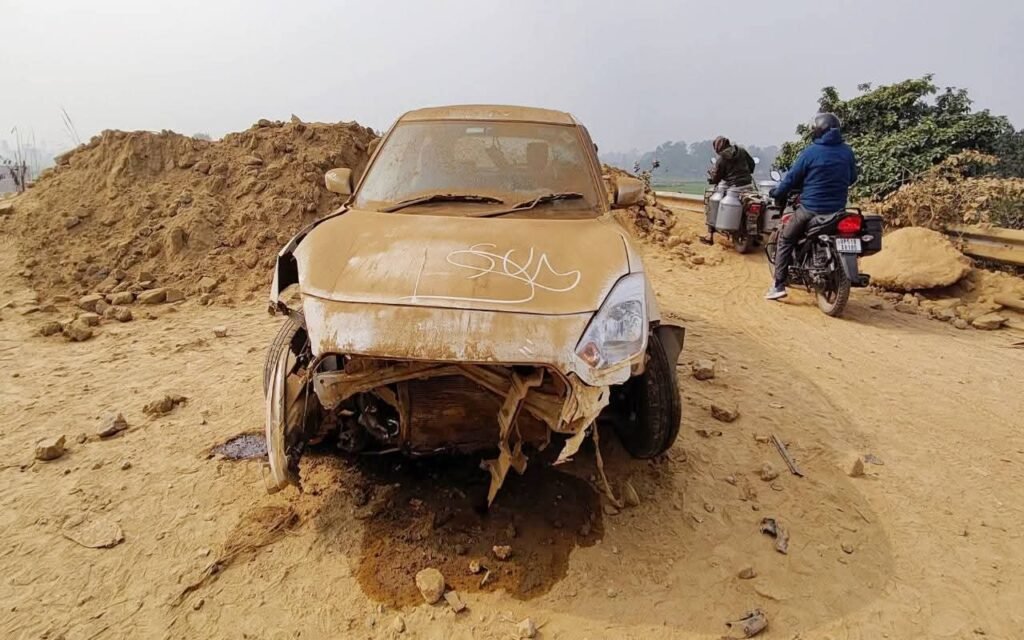 कलवारी टांडा पुल पर तेज रफ्तार कार मिट्टी के ढेर से टकराई, संकेतक न होने से हुआ हादसा