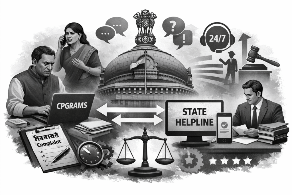 राज्य सरकार से जुड़ी शिकायतों के लिए हर राज्य में अलग व्यवस्था होती है। अधिकांश राज्यों में जनसुनवाई पोर्टल या मुख्यमंत्री हेल्पलाइन संचालित की जाती है, जहां नागरिक योजनाओं में गड़बड़ी, लाभ न मिलने या अधिकारियों के व्यवहार से जुड़ी शिकायत दर्ज करा सकते हैं।