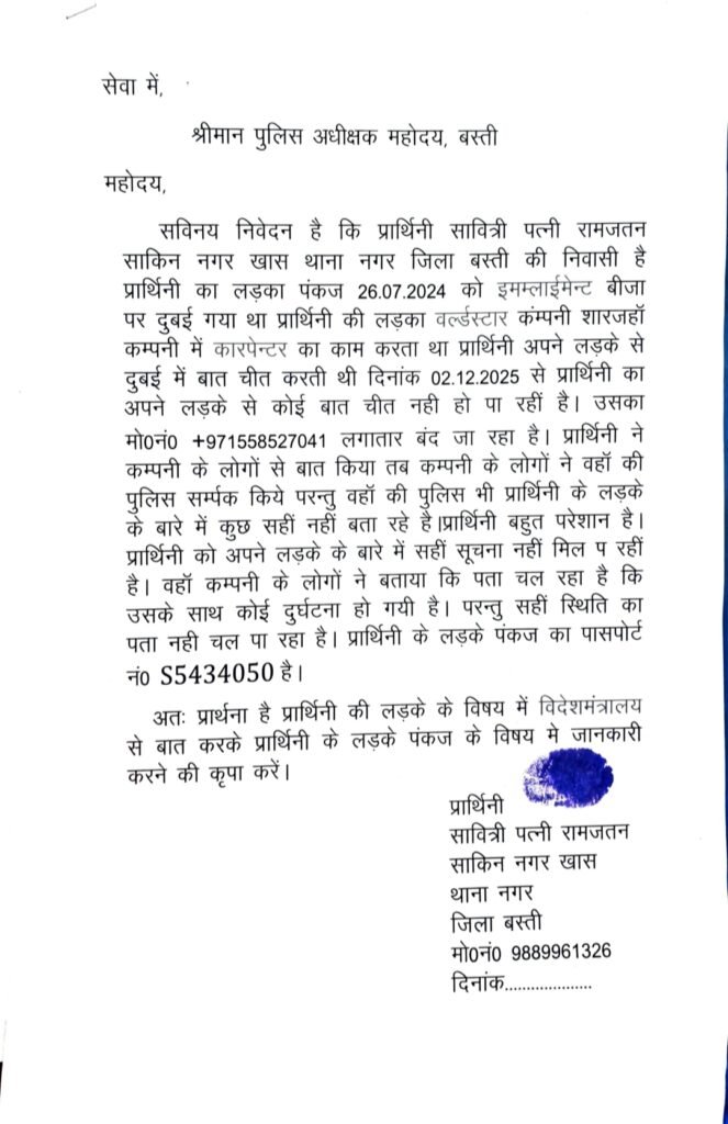 प्राप्त जानकारी के अनुसार सावित्री का पुत्र पंकज 26 जुलाई 2024 को दुबई स्थित वर्ल्ड स्टार कंपनी शारजहाँ में कारपेंटर के पद पर कार्य करने गया था। शुरुआत में वह अपनी मां से नियमित रूप से बातचीत करता रहा, लेकिन 2 दिसंबर 2025 के बाद से उसका मोबाइल नंबर लगातार बंद आ रहा है और तब से अब तक उसका कोई पता नहीं चल सका है। मामले में जो उसके साथ के लोगों से संपर्क किया गया उन लोगों ने कहा कि उसका कहीं पता नहीं चल रहा है, लेकिन सही स्थिति का पता नहीं चल पाया | इस अचानक संपर्क टूटने से परिवार में चिंता और भय का माहौल है, वहीं सावित्री बेटे की चिंता में बेहद परेशान हैं।