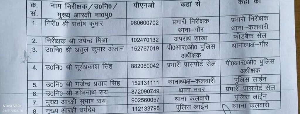 📍इसके अलावा मुख्य आरक्षी स्तर पर भी फेरबदल किया गया है। मुख्य आरक्षी सुभाष राय को थाना कलवारी से स्थानांतरित कर पुलिस लाइन भेजा गया है, जबकि मुख्य आरक्षी धर्मदेव को पुलिस लाइन से स्थानांतरित कर थाना कलवारी में तैनाती दी गई है।