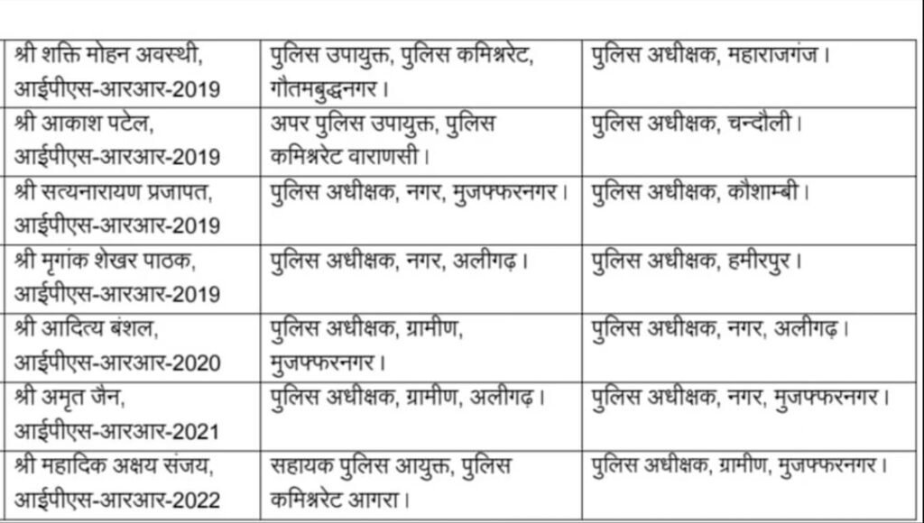 इस फेरबदल में युवा आईपीएस अधिकारियों को भी प्रमुख जिम्मेदारियां दी गई हैं। शक्ति मोहन अवस्थी को महाराजगंज, आकाश पटेल को चंदौली और सत्यनारायण प्रजापत को कौशांबी का पुलिस अधीक्षक बनाया गया है।