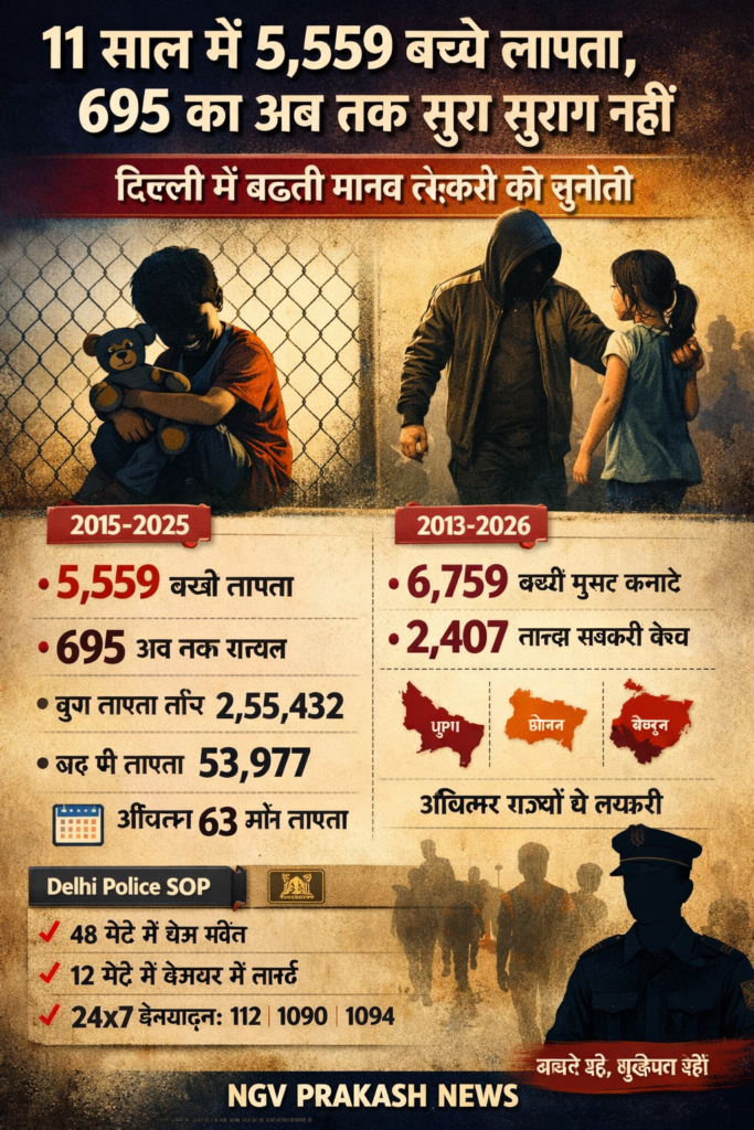 📍राजधानी दिल्ली में मानव तस्करी और लापता बच्चों का मुद्दा लगातार गंभीर होता जा रहा है। दिल्ली पुलिस के जिपनेट आंकड़ों के अनुसार वर्ष 2015 से 2025 के बीच 18 वर्ष तक के 5,559 बच्चे और किशोर लापता हुए, जिनमें से 4,864 को पुलिस ने ढूंढ लिया, जबकि 695 बच्चों का अब तक कोई सुराग नहीं मिल सका है।