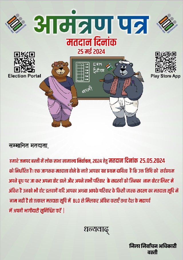जिलाधिकारी द्वारा जारी किए गए आमंत्रण पत्र में जिले के सभी मतदाताओं से अधिक से अधिक संख्या में अपने मतदान केंद्रों पर पहुंचकर मतदान करने की अपील की गई है |