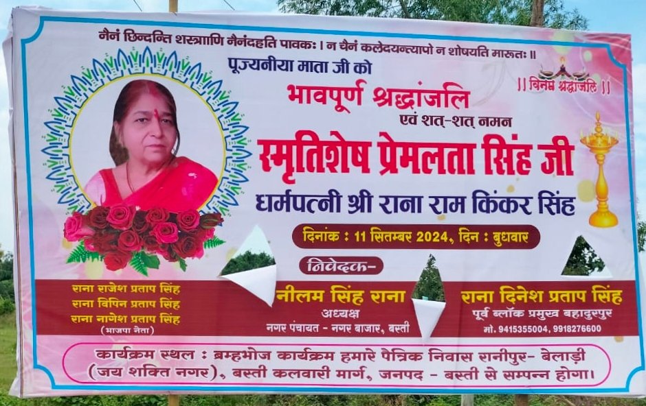 पूर्व ब्लाक प्रमुखऔर समाजसेवी तथा नगर पंचायत अध्यक्ष प्रतिनिधि राणा दिनेश प्रताप सिंह “सुड्डू ” की माता के निधन पर आज उनके पैतृक निवास गांव रानीपुर -बेलाड़ी,बस्ती पर मृतक की आत्मा की शांति के लिए श्रद्धांजलि तथा ब्रम्हभोज का आयोजन हुआ |