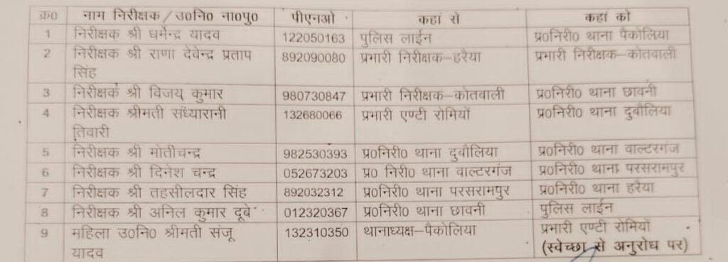 पुलिस अधीक्षक गोपाल कृष्ण चौधरी ने 8 निरीक्षक और उपनिरीक्षक के कार्य क्षेत्र में किया व्यापक बदलाव निरीक्षक धर्मेंद्र यादव को पुलिस लाइन से पैकोलिया थानें की कमान,
