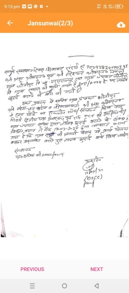 ह्ररैया तहसील के परशुरामपुर विकासखंड के अंतर्गत ग्राम जितीपुर में जनसुनवाई के माध्यम से दिए गए आवेदन पत्र के निस्तारण संबंधित आदेश 27 अगस्त 24 को खंड विकास अधिकारी द्वारा वित्तीय वर्ष 2024 -25 में करवाने के लिए कहा गया है |